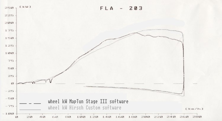 When I told Hirsch about the hardware modifications I had done to my car, they told me I would not get more than 280 hp "stable" out of the car because of injector and turbocharger restrictions. The Dyno session at Heisel showed that Hirsch reached exactly the claimed figure. Compared the same day and using the same hardware setup, the MapTun software is stronger until the 4000 rpm point (biggest difference, again at 3100 rpm, 26 hp), where power starts going down again, while the Hirsch software pushes on steadily until reaching max power at 4500 rpm and keeping it up until the red line. (The corrected graphs were removed by hand because of incorrectly measured transmission loss on the best MapTun run).
